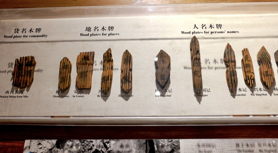 随香料出土的还有96件木质货牌签,标有人名、地名、商号、货名,用于运输管理,便于识别货主、货物。